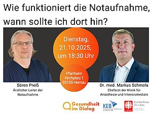 Viele Menschen sind unsicher, wann ein Besuch in der Notaufnahme wirklich notwendig ist - und wann andere Anlaufstellen wie der ärztliche Bereitschaftsdienst oder die Hausarztpraxis geeigneter wären. In dieser Veranstaltung geben Ihnen zwei erfahrene Experten des Caritas-Krankenhauses St. Lukas einen informativen Einblick in die Abläufe der Notaufnahme: Sören Preiß, Ärztlicher Leiter der Notaufnahme und Dr. med. Markus Schmola, Chefarzt der Klinik für Anästhesie und Intensivmedizin erklären, wie die medizinische Ersteinschätzung (Triage) funktioniert, welche Fälle als besonders dringlich gelten und wie Entscheidungen über die Behandlungsreihenfolge getroffen werden. Im Anschluss haben Sie die Gelegenheit, Ihre Fragen direkt an die Referenten zu stellen. Kommen Sie gerne spontan vorbei - wir freuen uns auf Sie!