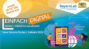 Auch im Jahr 2026 setzt das BayernLab seine kostenfreie Veranstaltungsreihe „Einfach digital!“ fort. Jeden ersten Dienstag im Monat erwarten Sie im BayernLab Nabburg kompakte Impulse zu digitalen Alltagsthemen – einfach erklärt und mit Raum für Ihre Fragen.